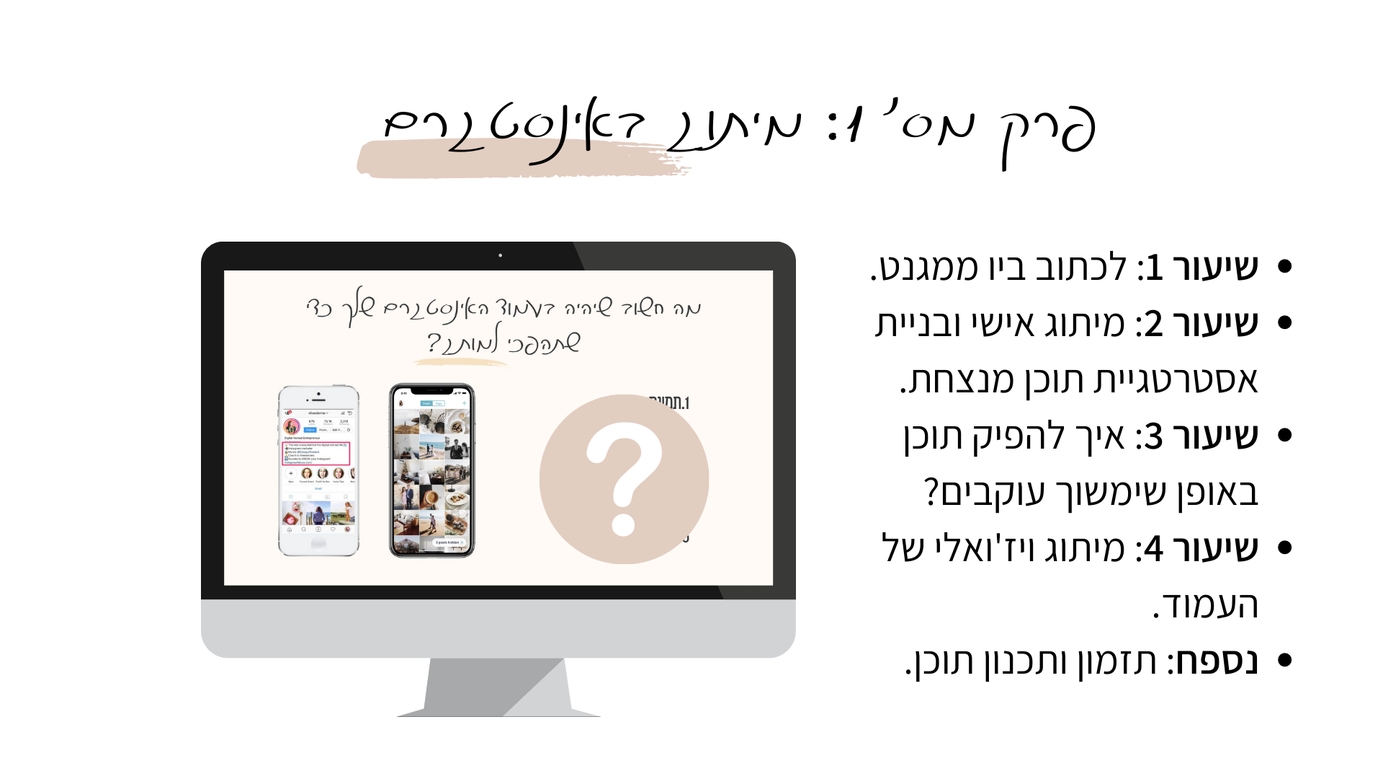 כל הקורסים של אינסטגרם שיש היום בשוק מלמדים אותך את כל המסביב: איך לעצב, איך לכתוב, איך לעשות רילסים, איך להעלות את העוקבים, שכל זה זה נחמד אבל זה לא התכל'ס.